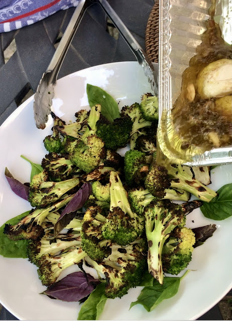 Remove the grilled broccoli to the platter with the fresh mozzarella (you can also throw the cheese in the pan with the bagna cauda for extra gooeyness).